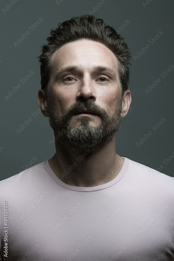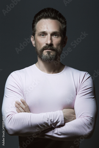 Fabulous At Any Age Portrait Of 40 Year Old Man Standing Over Dark Gray Background Classic Style Scar On Forehead Hands Crossed Studio Shot Buy This Stock Photo And Explore Similar Images At