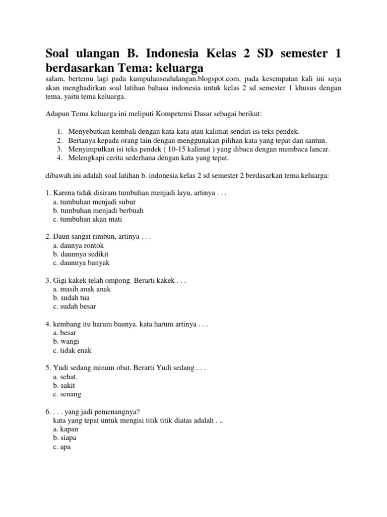 Soal Uas Bahasa Indonesia Kelas 1 Semester 1 Plus Kunci Jawaban Juragan Les