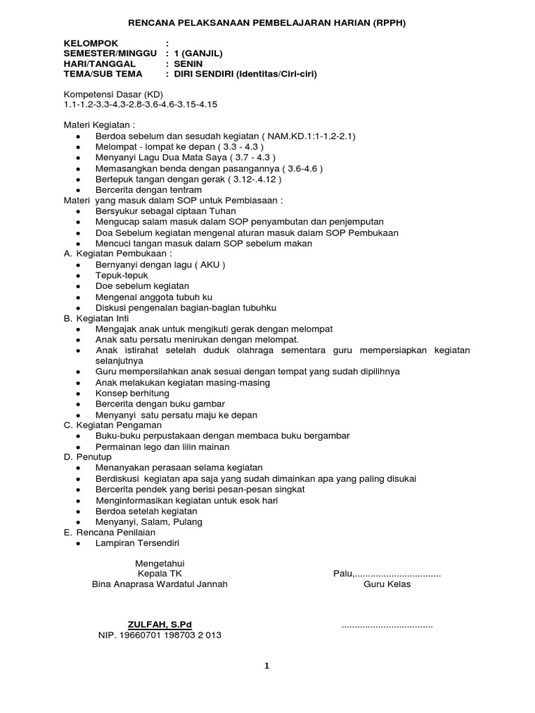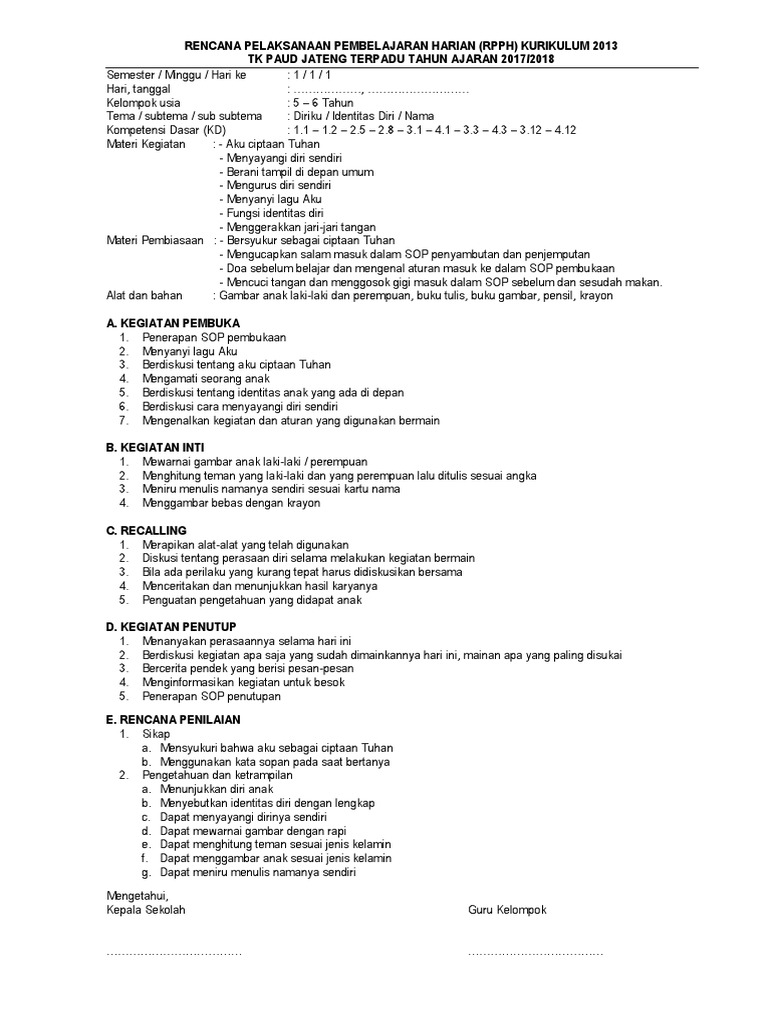 Contoh Rkh Rpph Paud Tema Diri Sendiri Documents