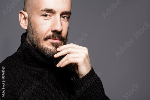 Fashion Portrait Of 40 Year Old Man Standing Over Light Gold Background In A Black Sweater Close Up Classic Style Bald Shaved Stock Image Image Of Looking Bald 111797933